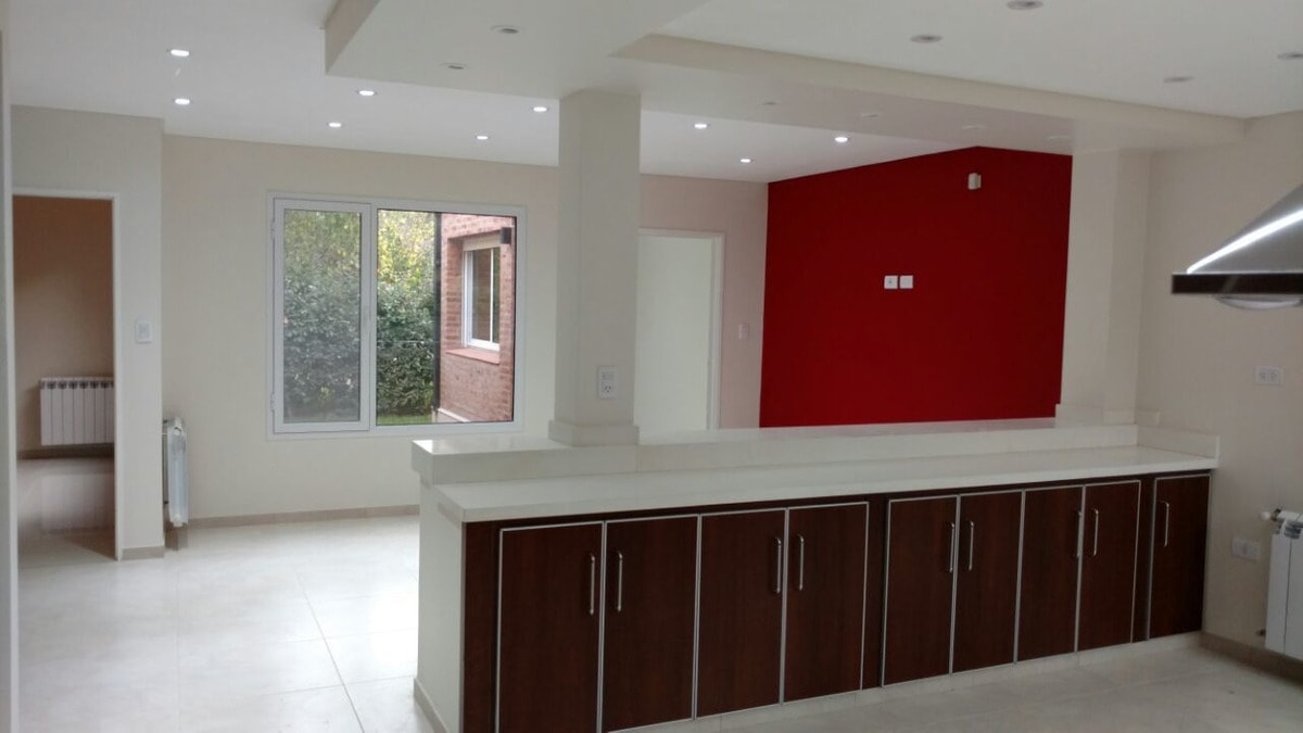 El frente de la casa tiene 1 living-comedor amplio con baño de recepción y vestidor, una estufa hogar a leña con doble vista hacia el comedor y hacia el living, doble circulacion de acceso hacia el comedor diario y cocina, el comedor diario esta semi integrado a la cocina a través de una barra desayunadora amplia.