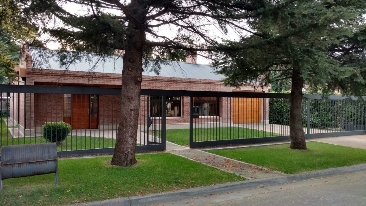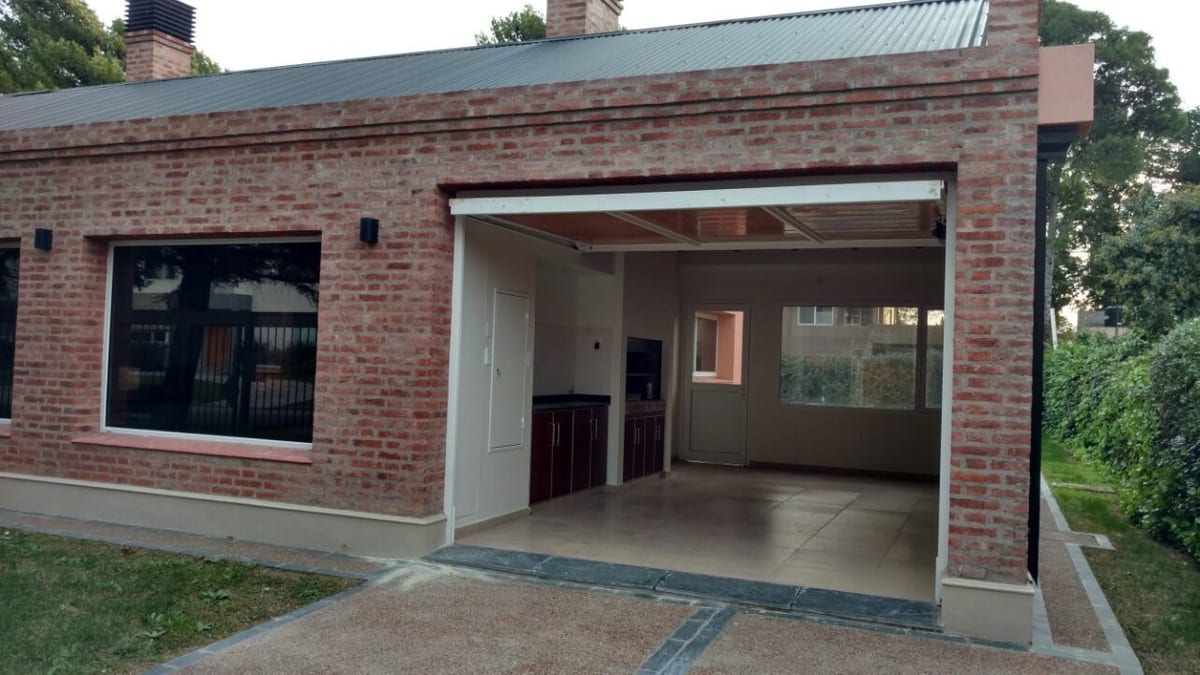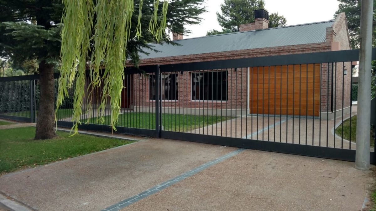jardin al frente, con un retiro de 6.25 mts frente al garagge, lo que permite dejar estacionado 2 autos afuera mas un tercer auto que queda cubierto en el garagge, el cual tiene porton corredizo eléctrico, con luz de cortesia, fogón parrilla, totalmente equipado.